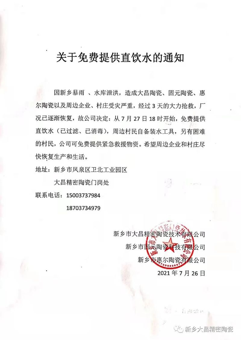 再次感謝大家的關心和支持,新鄉(xiāng)大昌陶瓷在黨和政府的關懷下,在兄弟單位和公司員工的鼎力相助下,定會眾志成城,抗洪救災,戰(zhàn)勝困難,復工復產(chǎn),重建大昌美好家園!